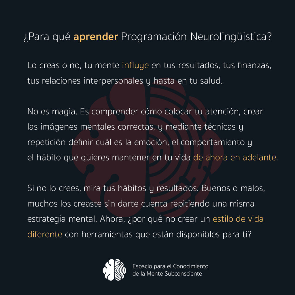 Respaldado por la Sociedad de Programación Neurolingüistica, para personas que quieran mejorar a nivel profesional, salud, relaciones y hábitos en general